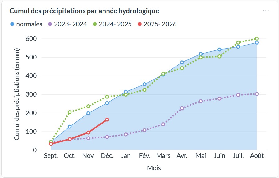 Malgré cela, au 19 décembre, le déficit pluviométrique demeure important, l’année hydrologique affichant un déficit de 35,4 %.