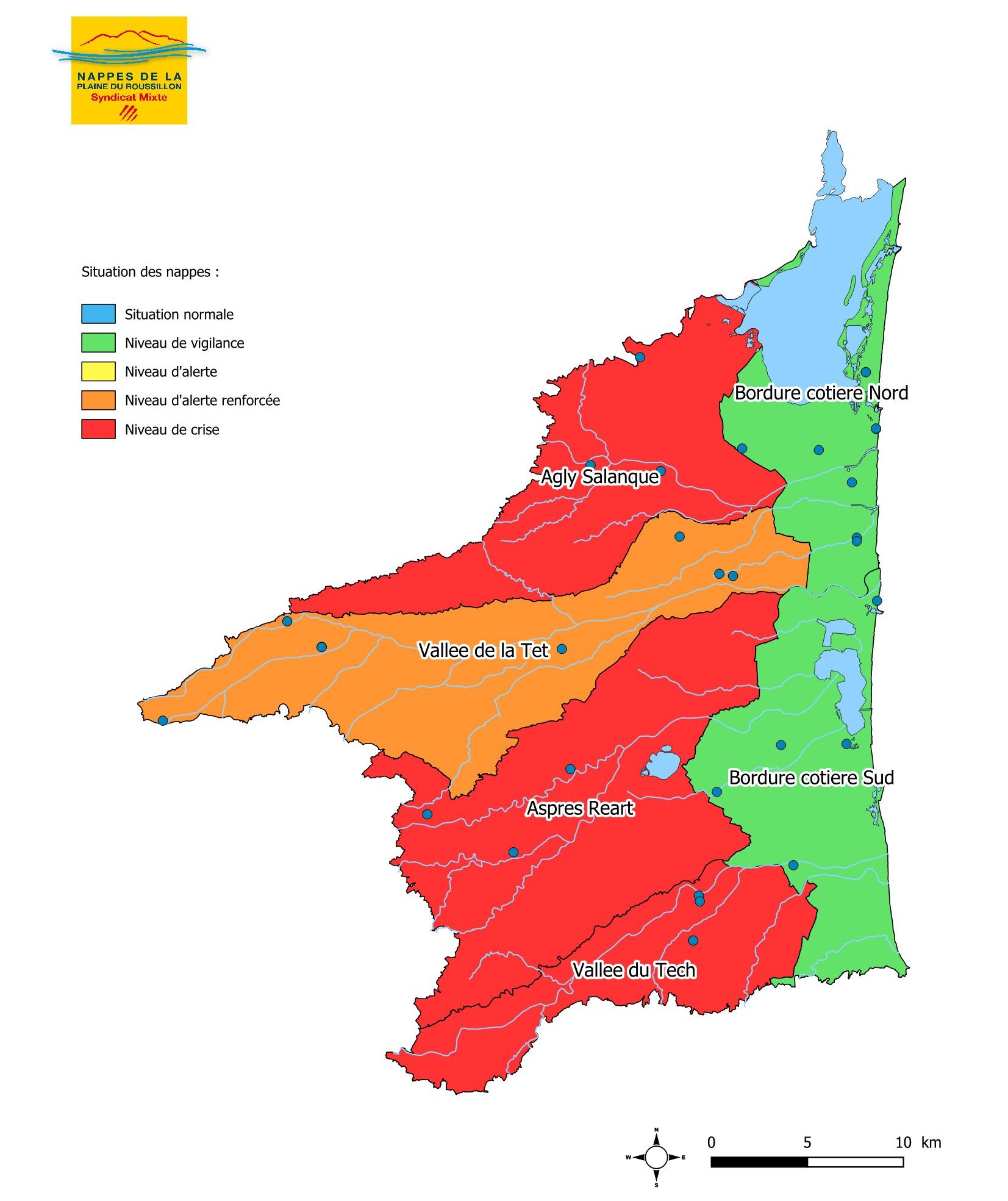 - U.G. Vallée de la Têt : en alerte renforcée. La situation continue de se dégrader ces dernières semaines (Millas et Bompas). A noter une amélioration temporaire du Quaternaire à Bouleternère liée à des lâchers du canal de Corbère dans le Boulès.