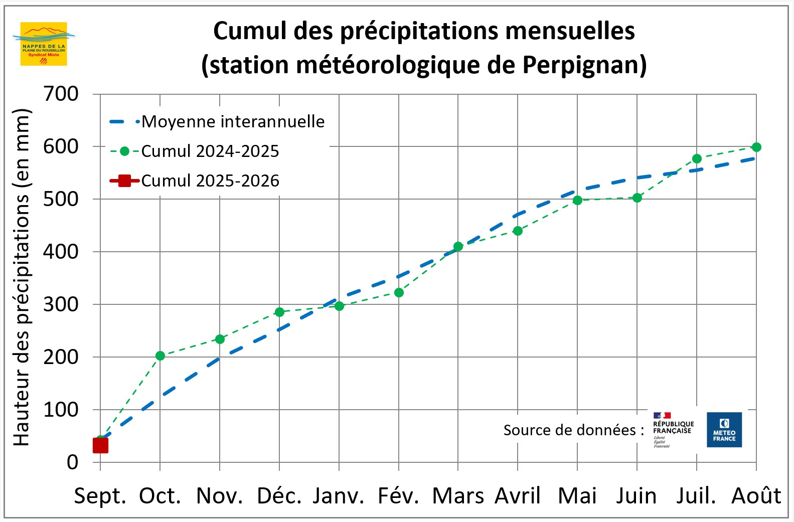 Après deux années de sécheresse, les précipitations 2024-2025 retrouvent un niveau proche de la normale, avec 599,6 mm enregistrés à la station Météo-France de Perpignan (+3,7 % par rapport à la moyenne).