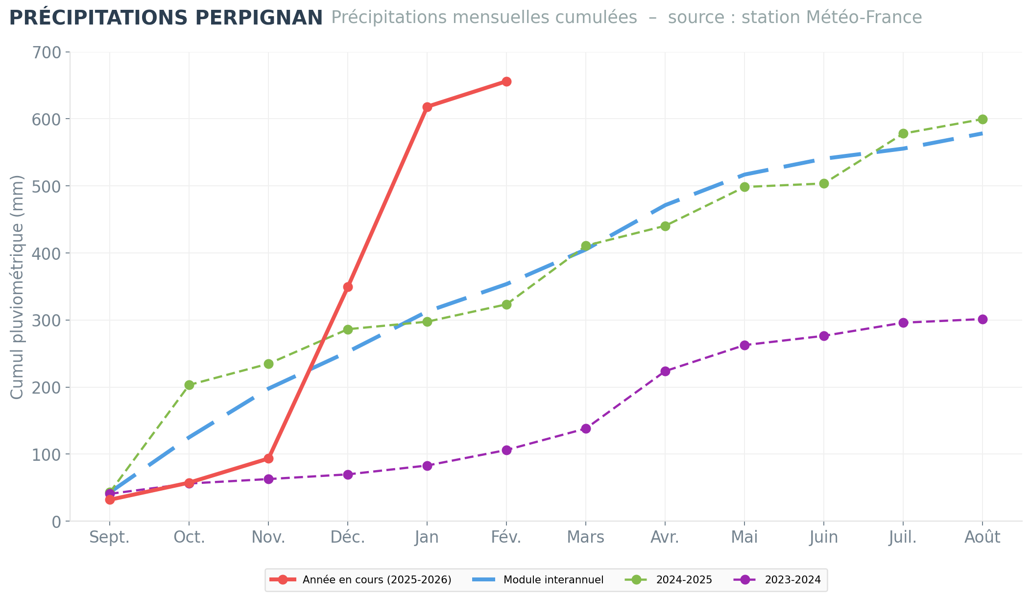 Bien que l’année hydrologique 2025-2026 ait débuté dans un contexte déficitaire, les précipitations enregistrées en décembre et en janvier ont été particulièrement importantes, atteignant respectivement 255,9 mm et 268,7 mm.